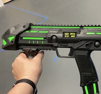 Equipment Overview: Cybertag equipment includes an ergonomic two-handled phaser called a “Blaster” with sensors inside the phaser as well as on the soft vest made of a durable cloth. Bases and energizer units are arena features of the system.