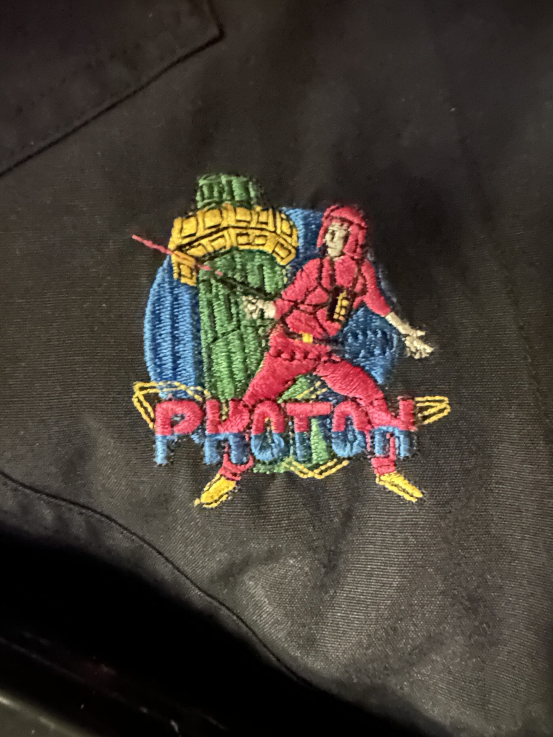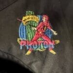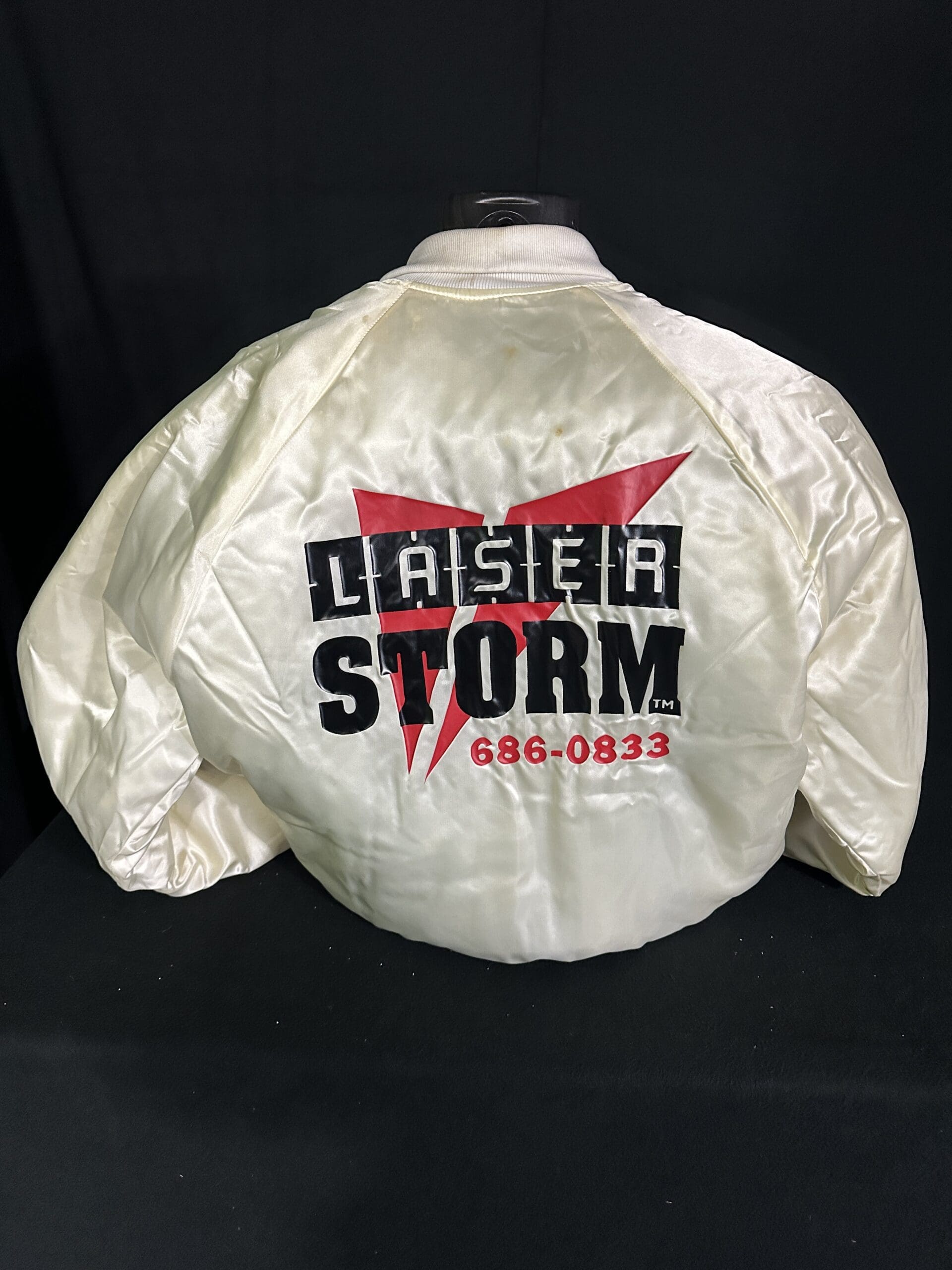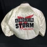 Laser Storm White Silk Logo Jacket (back) – one of the first pieces of Laser Storm clothing produced, formerly belonging to a player from arena 18 and provided courtesy of Laser Storm